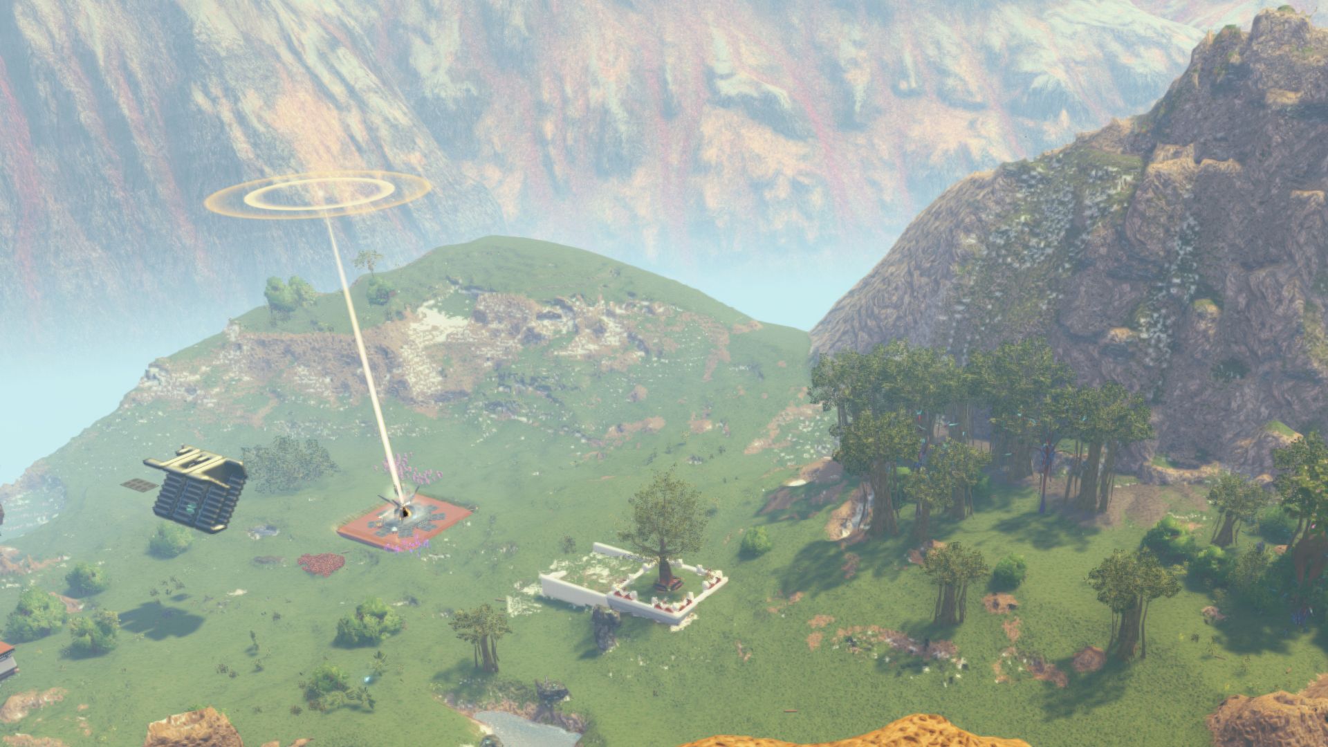 As for the tree in the center of my build, I originally wanted one of those crystal-leaved Banyan trees, that I mentioned during the last two posts on the test. But I wasn’t able to find one of these yet. All variations of Banyan trees I did come across so far, had green leaves. I don’t really know, if those crystal looking white-blueish leaves were ever intended. Could possibly also have been some sort of texture or shading bug. Since I wasn’t able to get the tree I wanted, I looked for another impressive large tree, and went with an oak. I later discovered that there’s now also a glowy variant of willow trees, which do look pretty nice as well. Not sure if should swap out the oak - it did grow pretty nice and tall, and I don’t think I can control what version of willow I would be getting, when planting one.