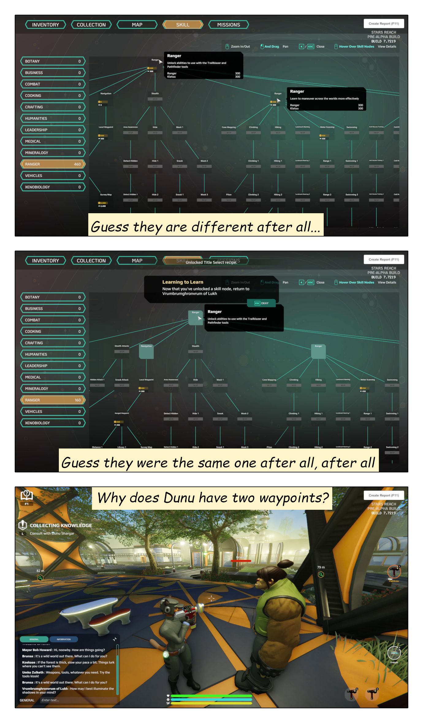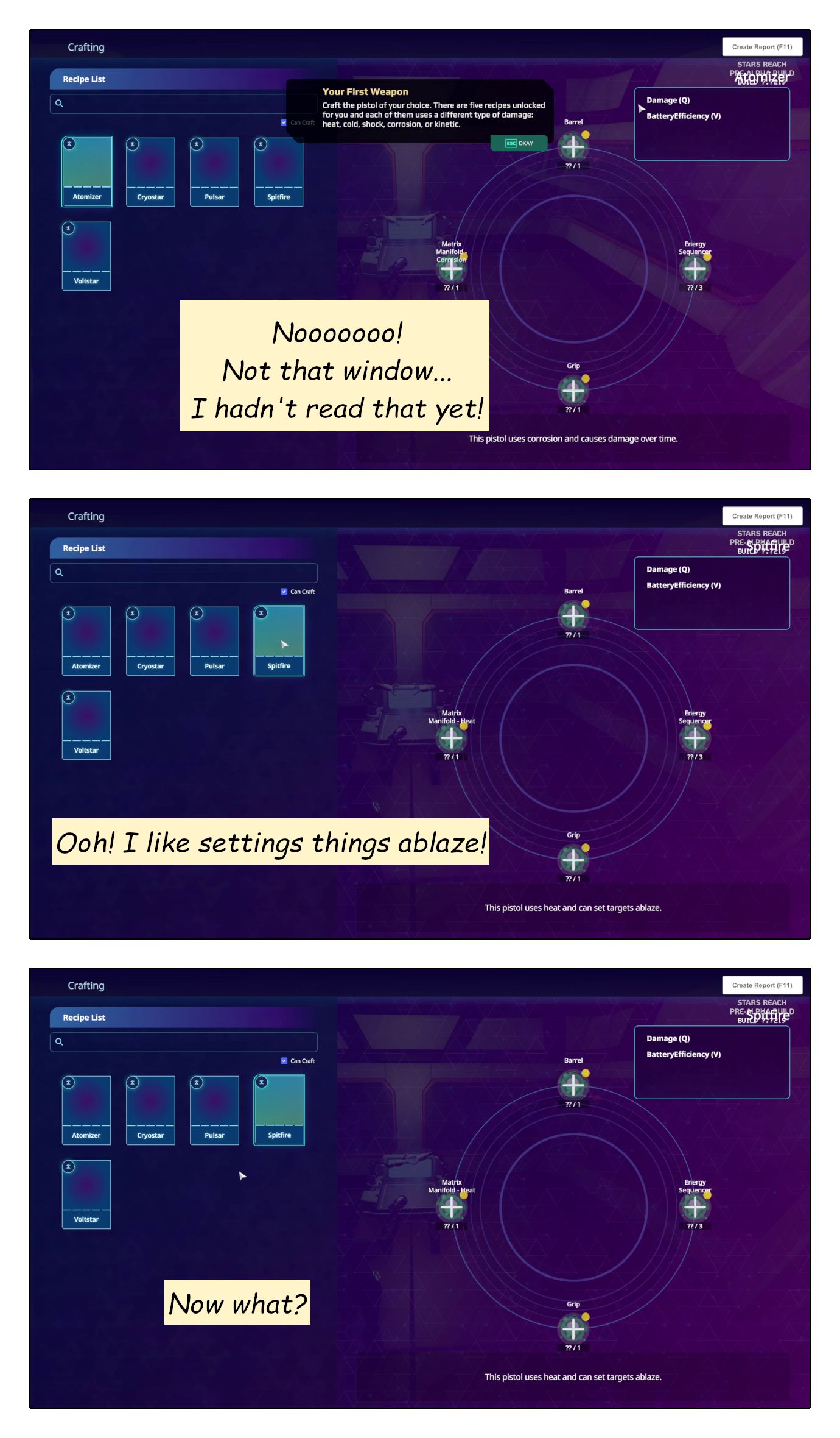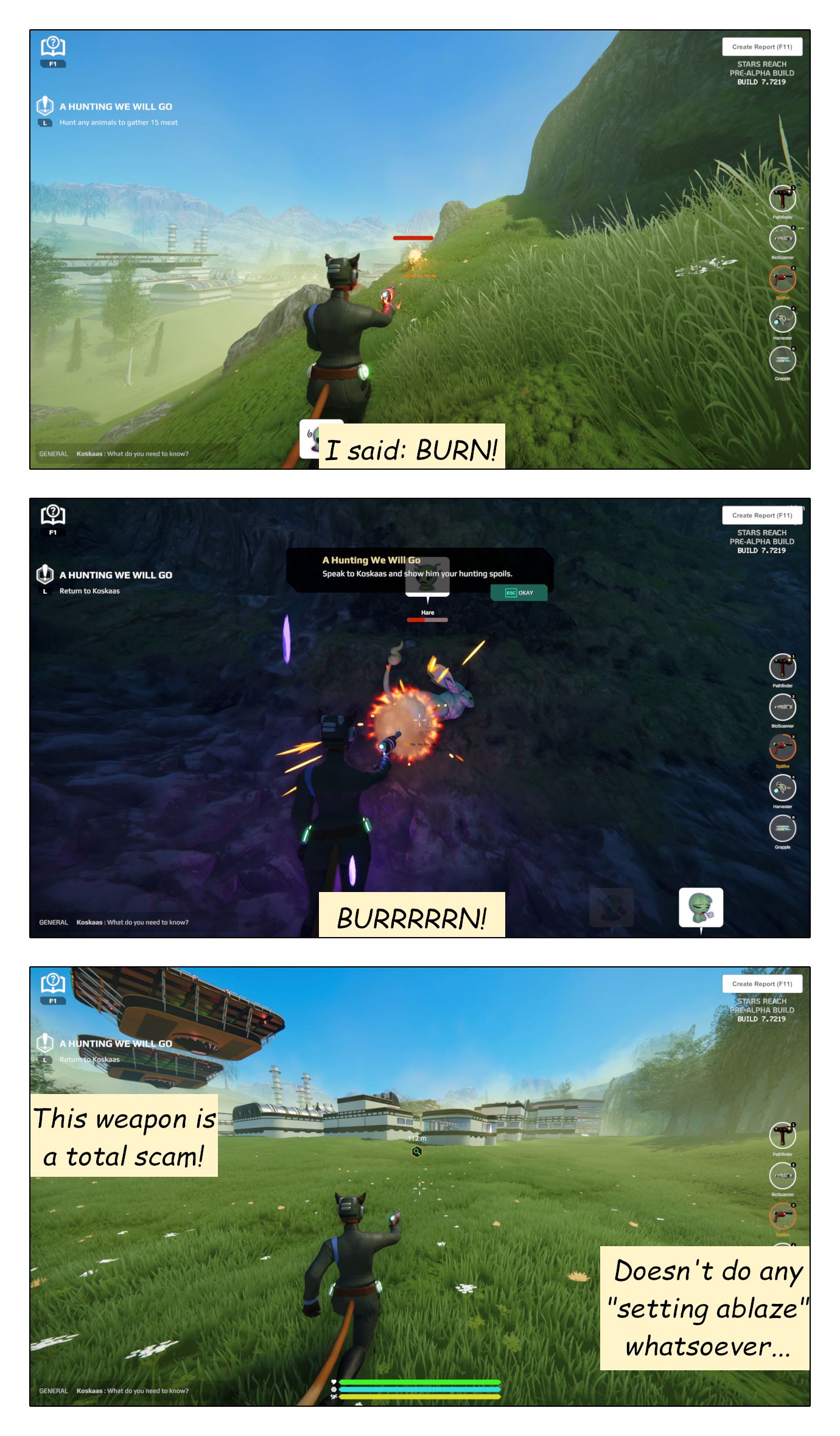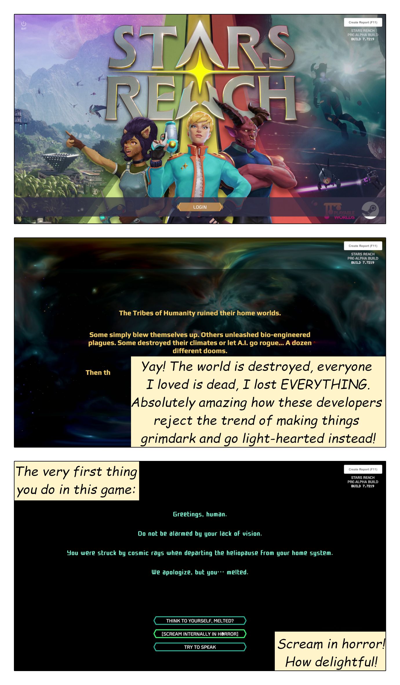 To me, Stars Reach feels like it is suffering an identity crisis. It kinda wants to be a sandbox, but instead of proudly presenting itself as a confident sandbox, it’s all ashamed and tries to hide everything that points at being a sandbox. For the first hour of play it now pretends to be a (weak and clunky) themepark. Because… I have absolutely no clue why! Maybe it suddenly no longer wants to be a sandbox after all? Maybe it’s bending over backwards to please some investors who don’t get it? I don’t know.
