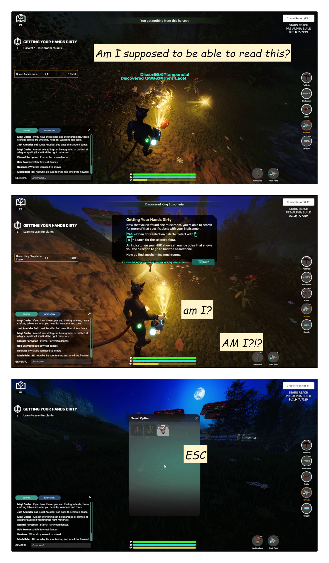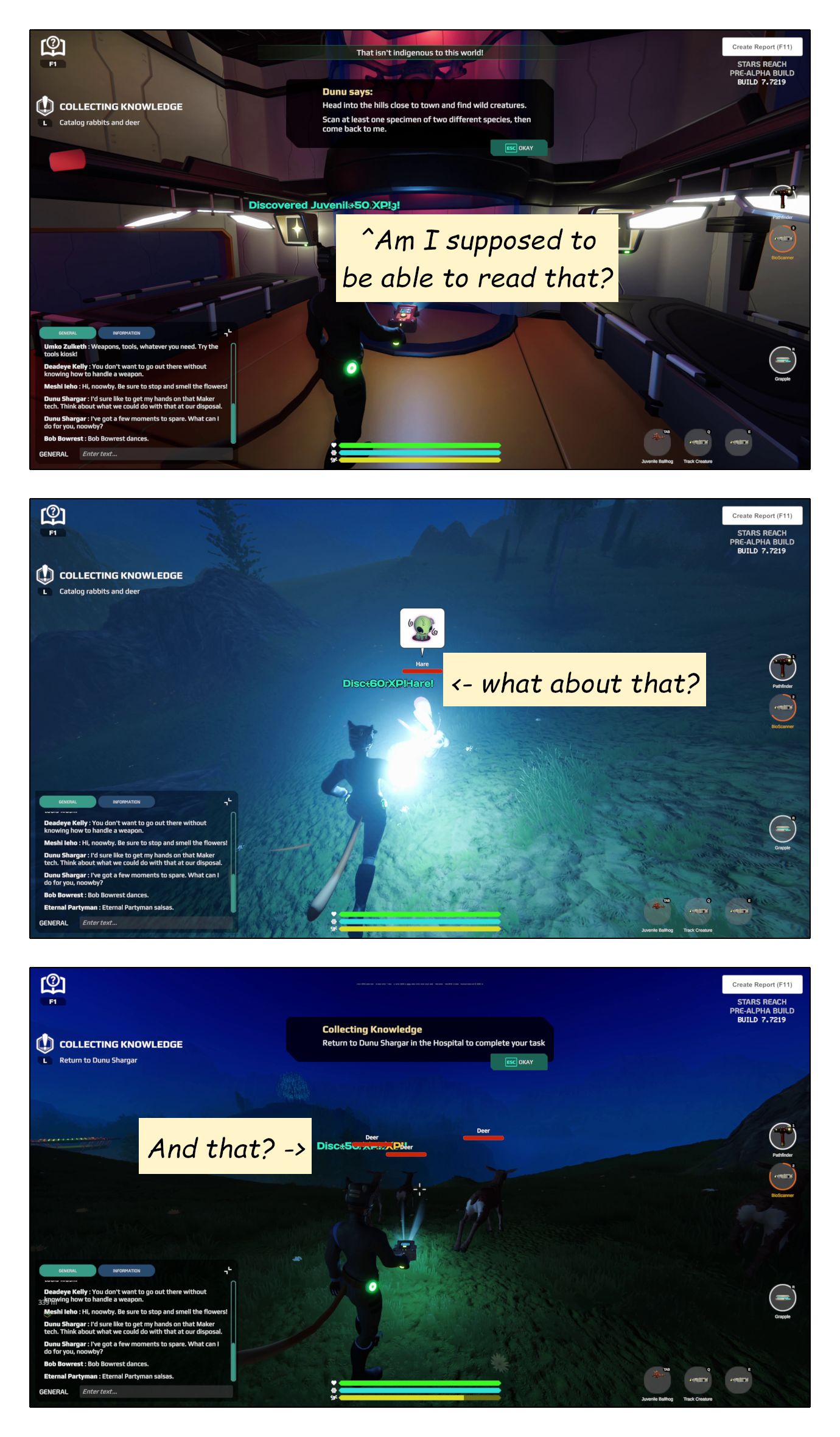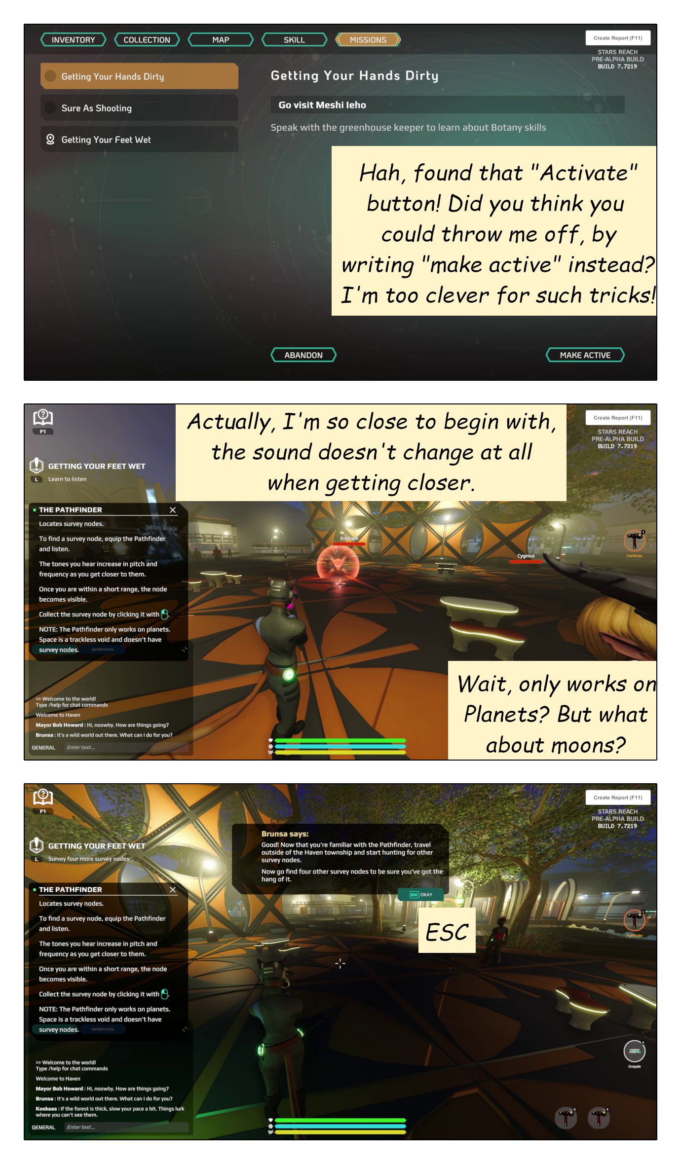 I further believe, that the purpose of a tutorial is to help the player find the fun in the game as quickly as possible. In the case of a sandbox game, that means helping understand the nature and appeal of sandbox gameplay and of player-driven systems. Check out my post What you need to know about Stars Reach for more detail on what I find really appealing about that. Spoiler: it’s NOT getting quest-rewards.